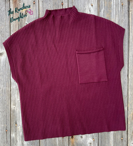 Deep Burgundy Fall Patch Pocket Rib Knit Short Sleeve Sweater