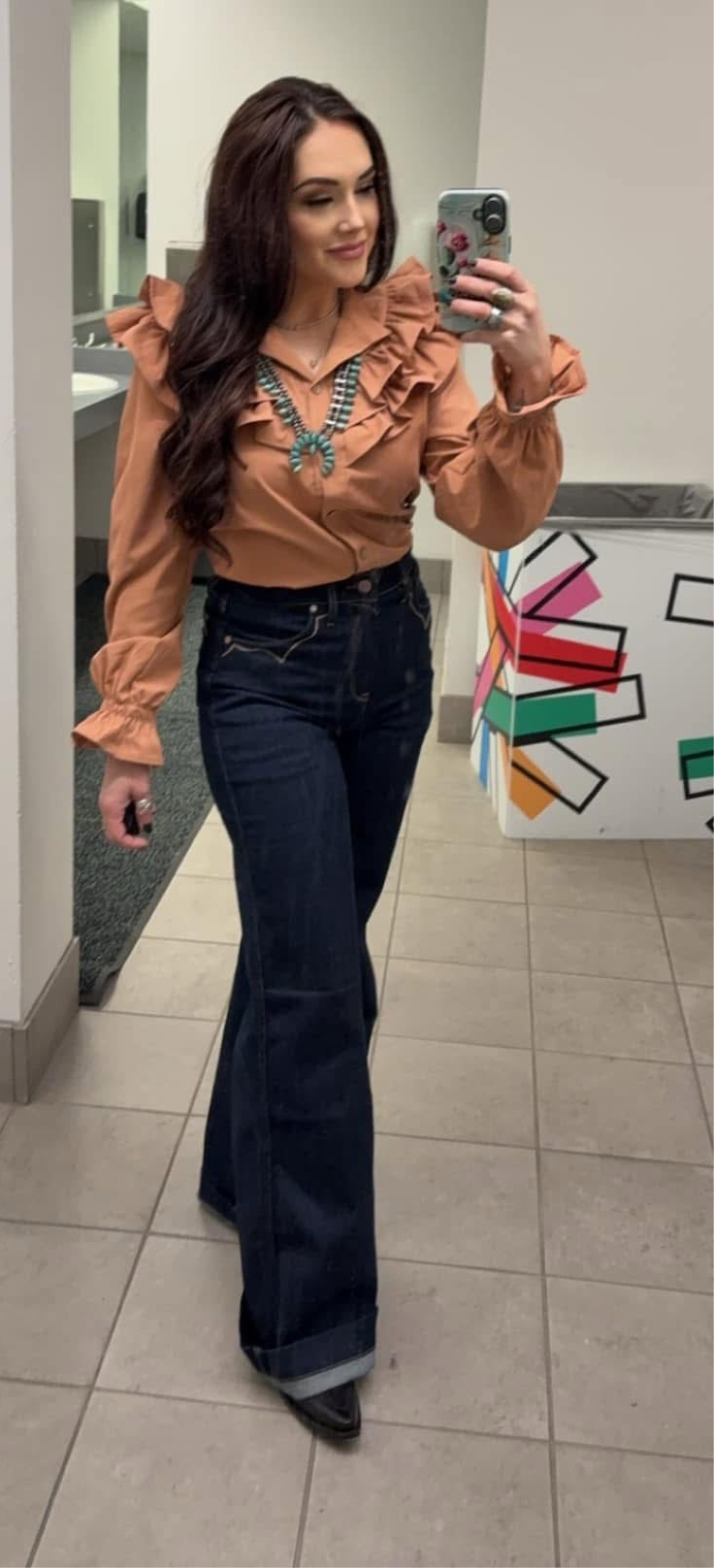 Wide legs, dark rinse, Western details—this jean checks all the trend boxes. Ultra-flattering and incredibly versatile, it shines in the arena and on the town. Delicate stitching adds to its ranch-chic vibe.